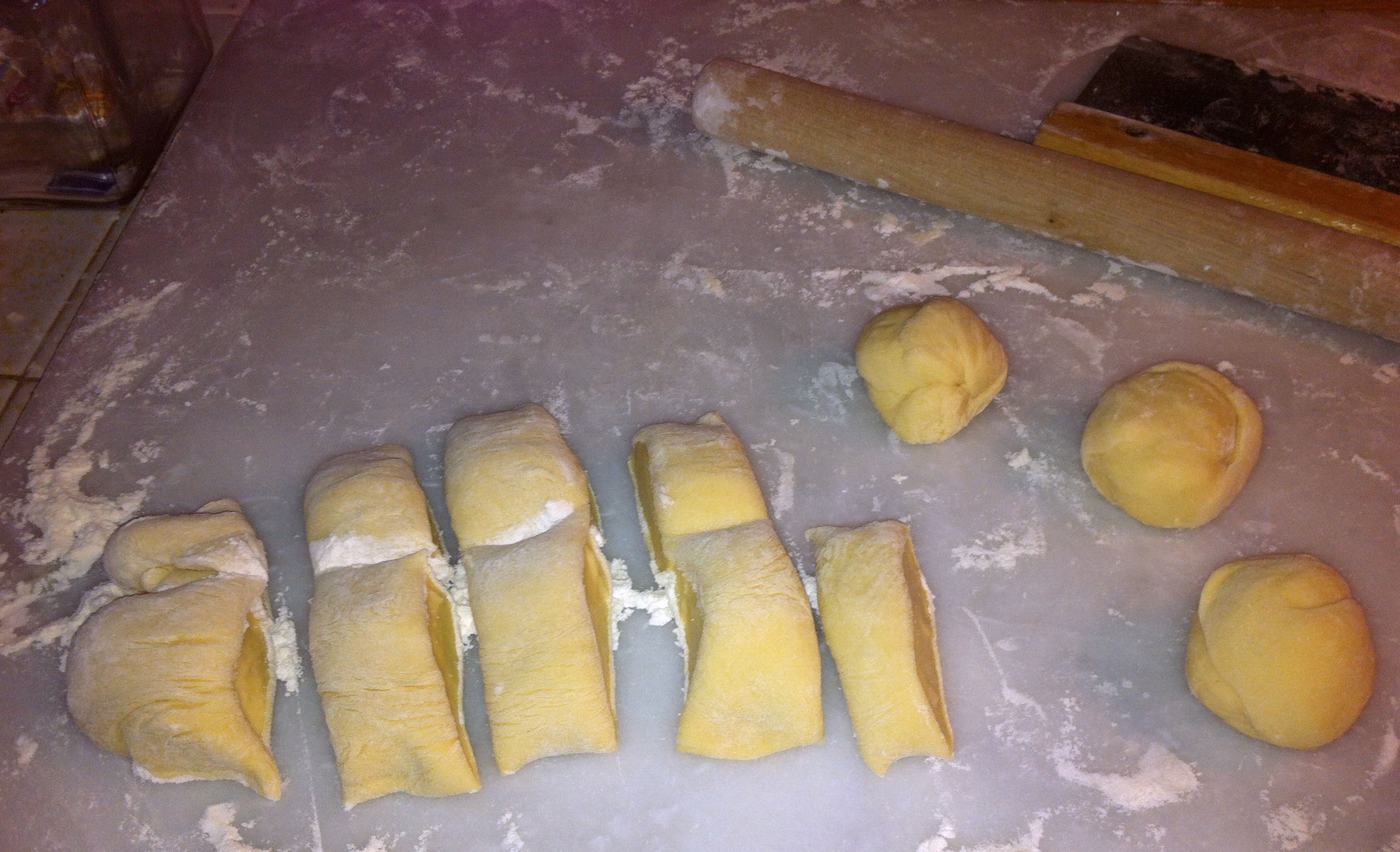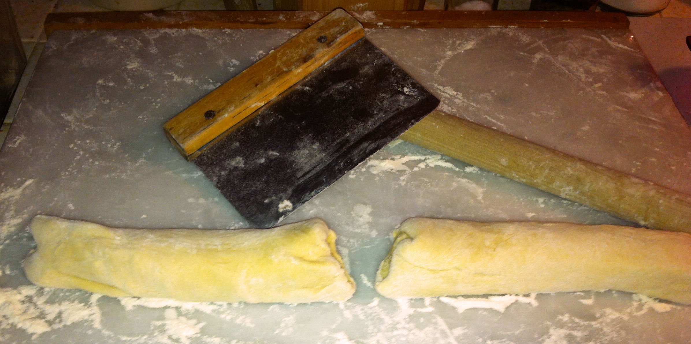 7. Divide your dough in half and roll each half into a snake about a foot long.