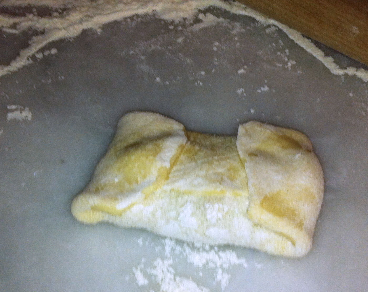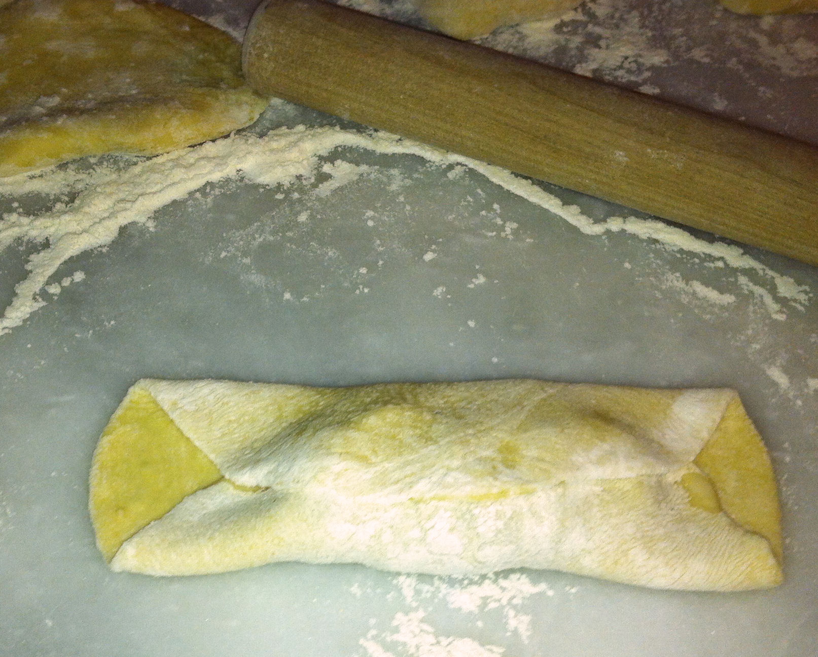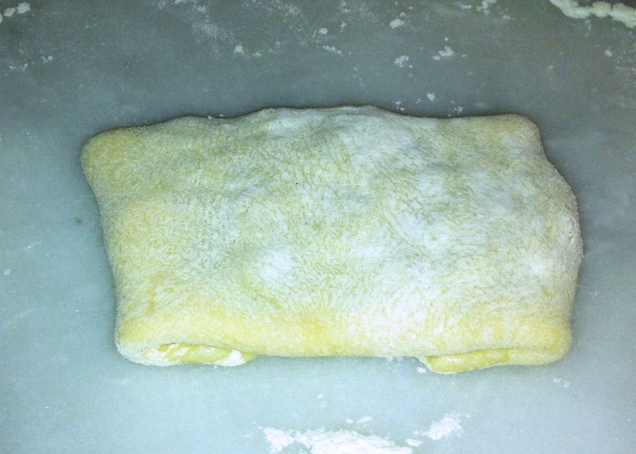 13. Moisten the open ends of the dough packet and fold each end in by a quarter of its width.