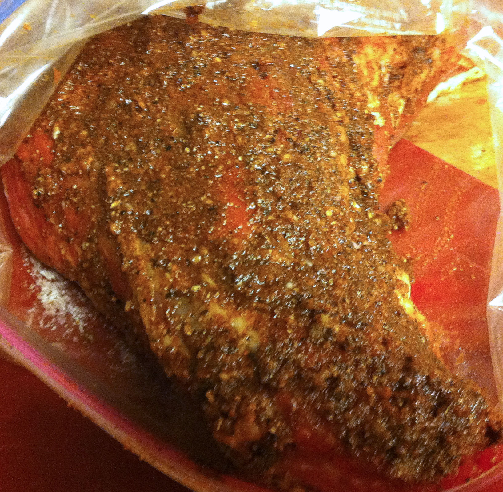 4. Spread the spice paste all over the meat and let it marinate in a gallon plastic bag for at least 4 hours.