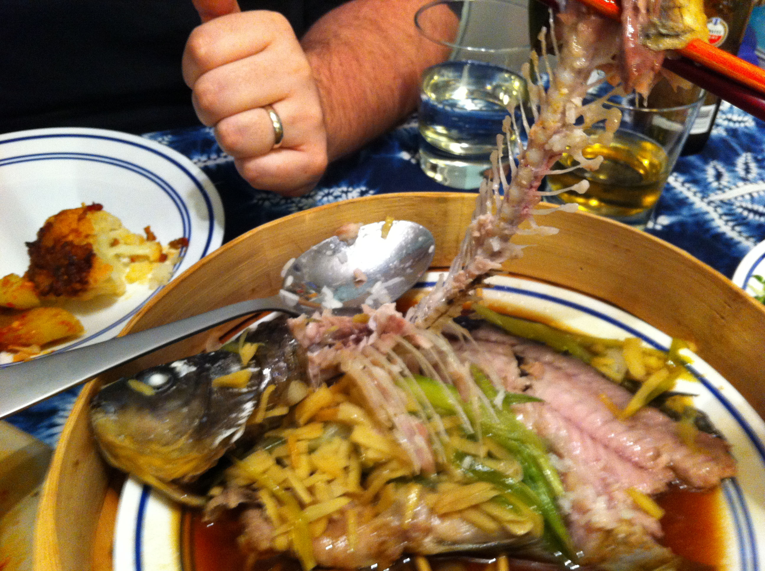 This same Chinese friend told us that after you had eaten the top half of the steamed fish you never turn the fish over to eat the other side. He explained the Chinese traditional belief was that doing so would cause the fishing boats in the South China Sea to flip over. To get to the meat on the other side of the steamed fish, you simply break the spine near the tail and lift the spine up and out. Pulling the spine towards the head exposes the rest of the meat to your hungry diners.
