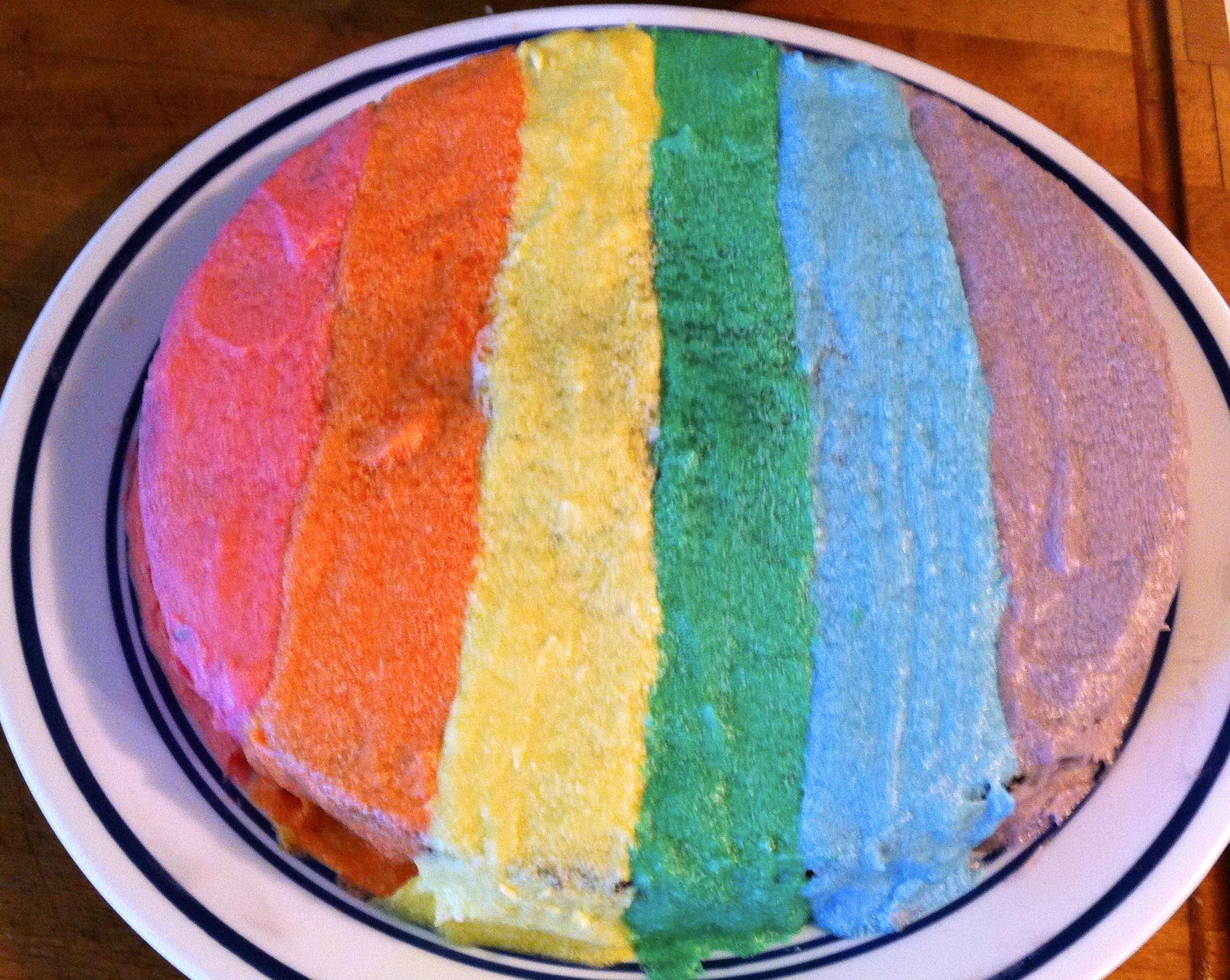 After Feeding Frenzy: I did get a taste, but 6 teenage girls licked the plate clean. In the afternoon the French Girl and Eilene baked a chocolate cake for dessert. A word on the frosting: Eilene’s friends call our home a LBGT safe house.
