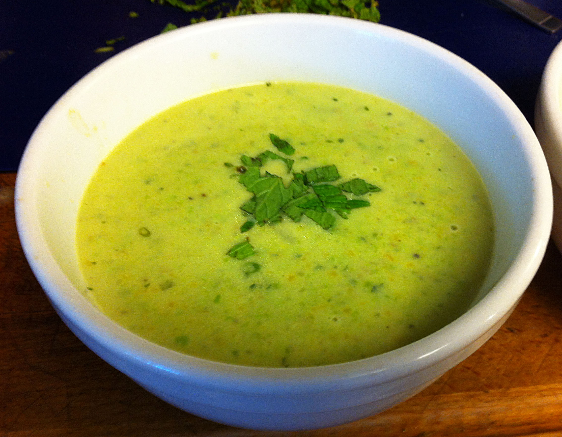 Some chicken broth will give the soup some depth. Just a touch of cream for the body. Finally, mint and peas are a classic pairing. I have some fresh mint left over from yesterday’s dinner, but I will add just a hint.