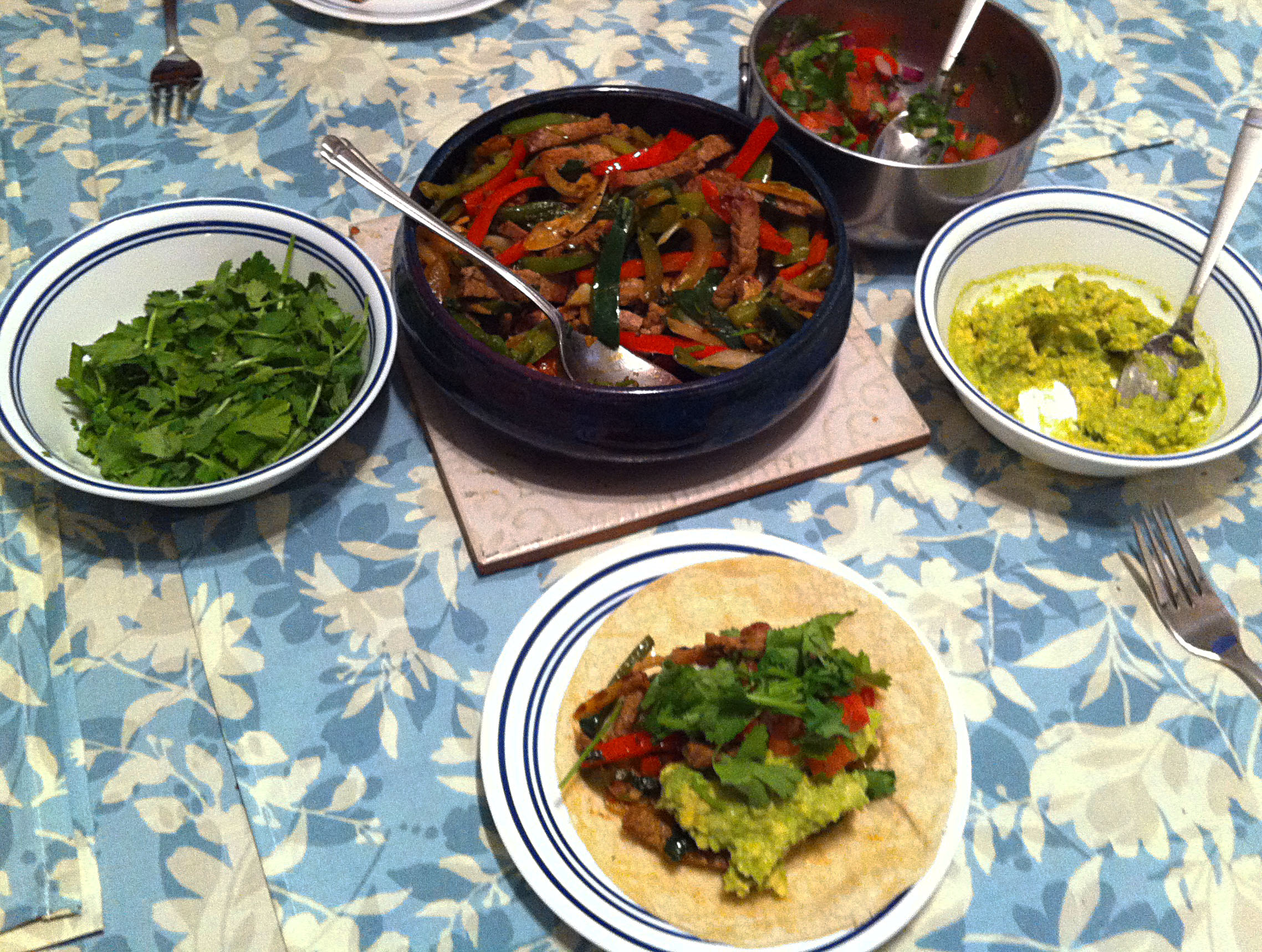 Properly made, the peppers in a fajita are quickly pan-seared. If you have a large cast iron skillet and a gas stove this is easy to do. I have only a sauté pan and a glass topped electric stove. Being hungry, I dumped all of my peppers in at once and, instead of searing, they sautéed in their own juices. For this dish to be cooked correctly—with the tools that I have at my disposal—required more finessing than I gave it.