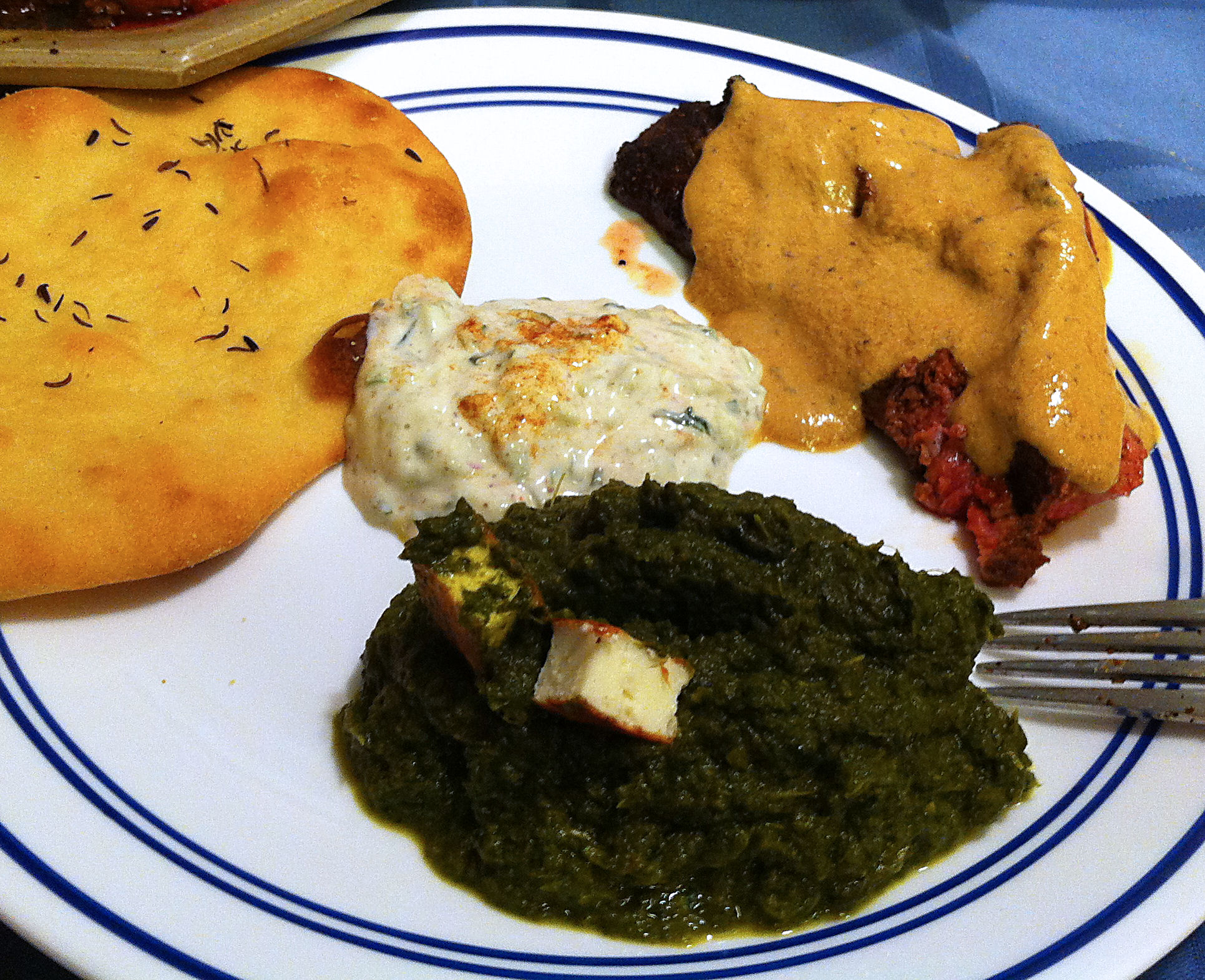 While I had originally intended to barbeque this lamb on the grill outside, San Jose’s weather did not cooperate. This turned into a “spare the air day” and it is illegal to “fire up the barbie.” Quickly adapting, I decided to broil my lamb. To round out my Indian feast I am making saag panneer, raita, and naan. Jan made a persimmon pumpkin pie for dessert.