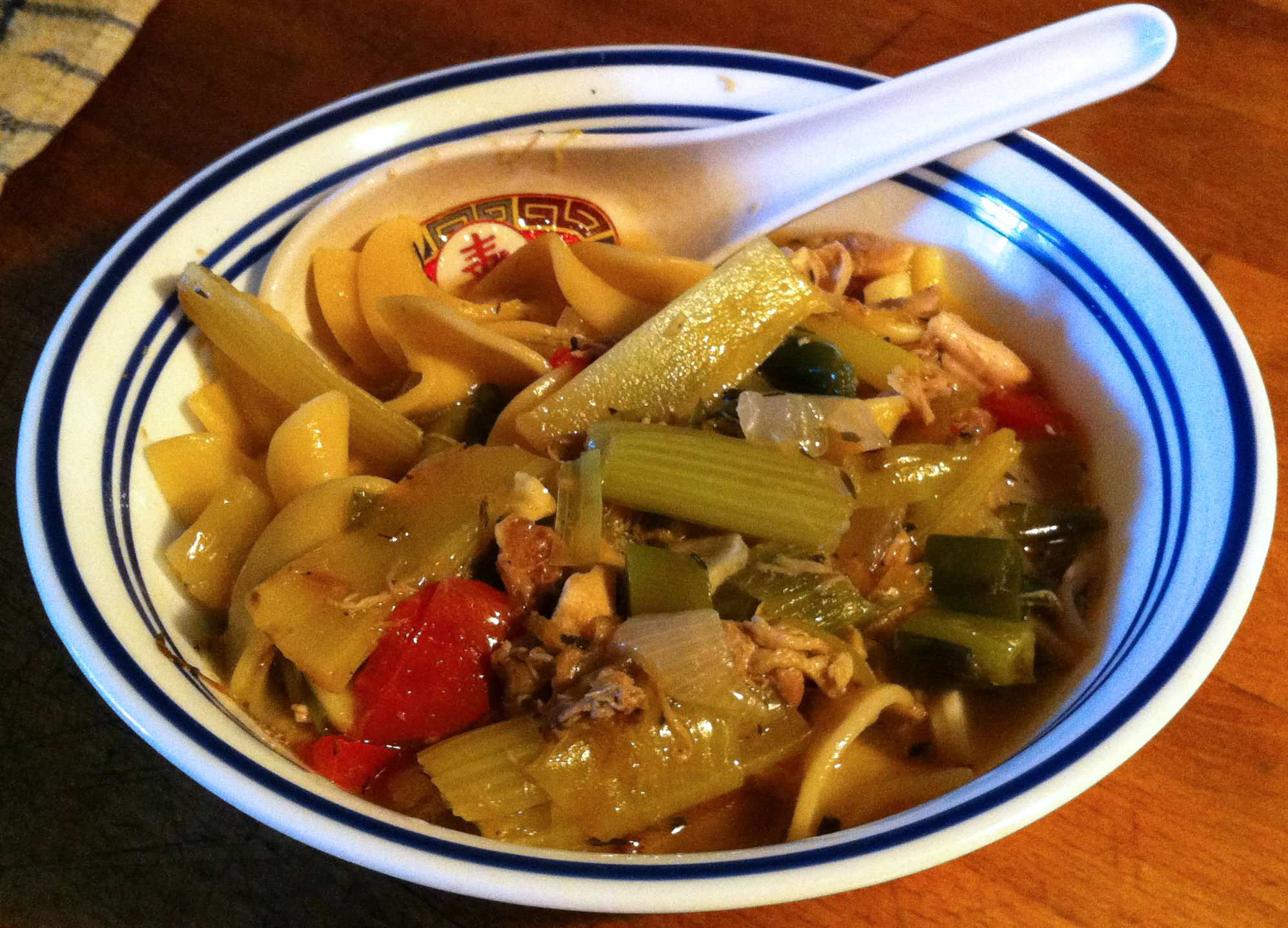 I make chicken soup with whatever bits I have in the refrigerator, the backbones and wingtips of chickens, leftover bits of vegetables from other meals. This recipe is never the same twice, because what vegetables go into it depends entirely on what I have on hand. I do try to get a balance of colors, starch and flavors, but it is always different.